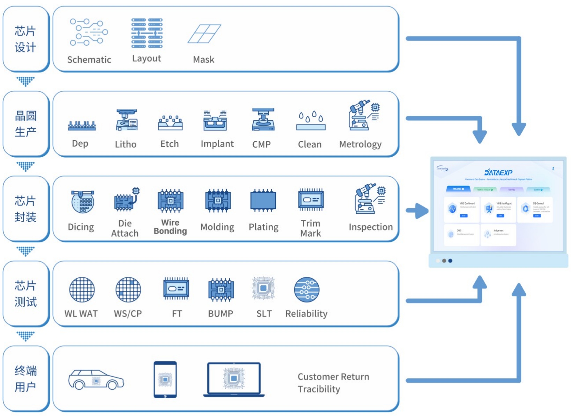 DataExp-YMS(简称: DE-YMS) 支持集成电路生产制造过程中的CP、FT、WAT、Inline、Defect、WIP等多类型数据智能化分析,为客户提供“一站式”数据分析管理平台。