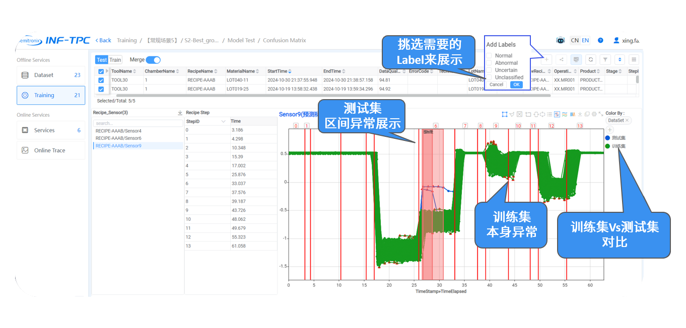 先进的异常检测方法能够识别半导体生产过程中的多种异常类型,包括区间异常、PM异常、振幅异常等,多场景准确率> 95%,为厂商提供全面的故障诊断和品质保障。